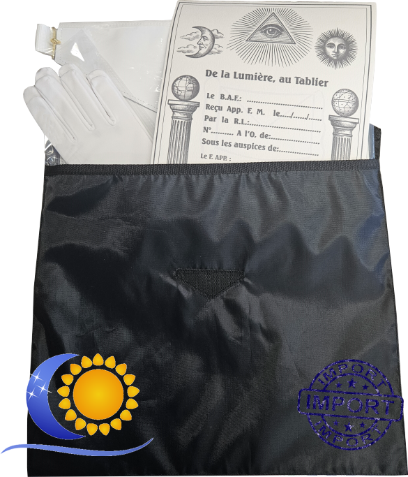 Kit apprenti complet pour Rite Ecossais Ancien et Accepté & rituel de style Emulation Comprenant un tablier d'apprenti en cuir dimensions 31X36 cm ( bavette repliée) avec poche au dos + une paire de gants coton ou synthetique + diplôme d'apprenti (35X24 cm papier semi cartonné texturé) + sacoche de transport. Très pratique à l'usage et au transport, comprend tous les éléments nécessaires à l'apprenti Utilisé le plus souvent à la Grande Loge Nationale Française, Grande Loge Traditionnelle et symbolique Opéra, Grande Loge de l'Alliance Maçonnique Française....