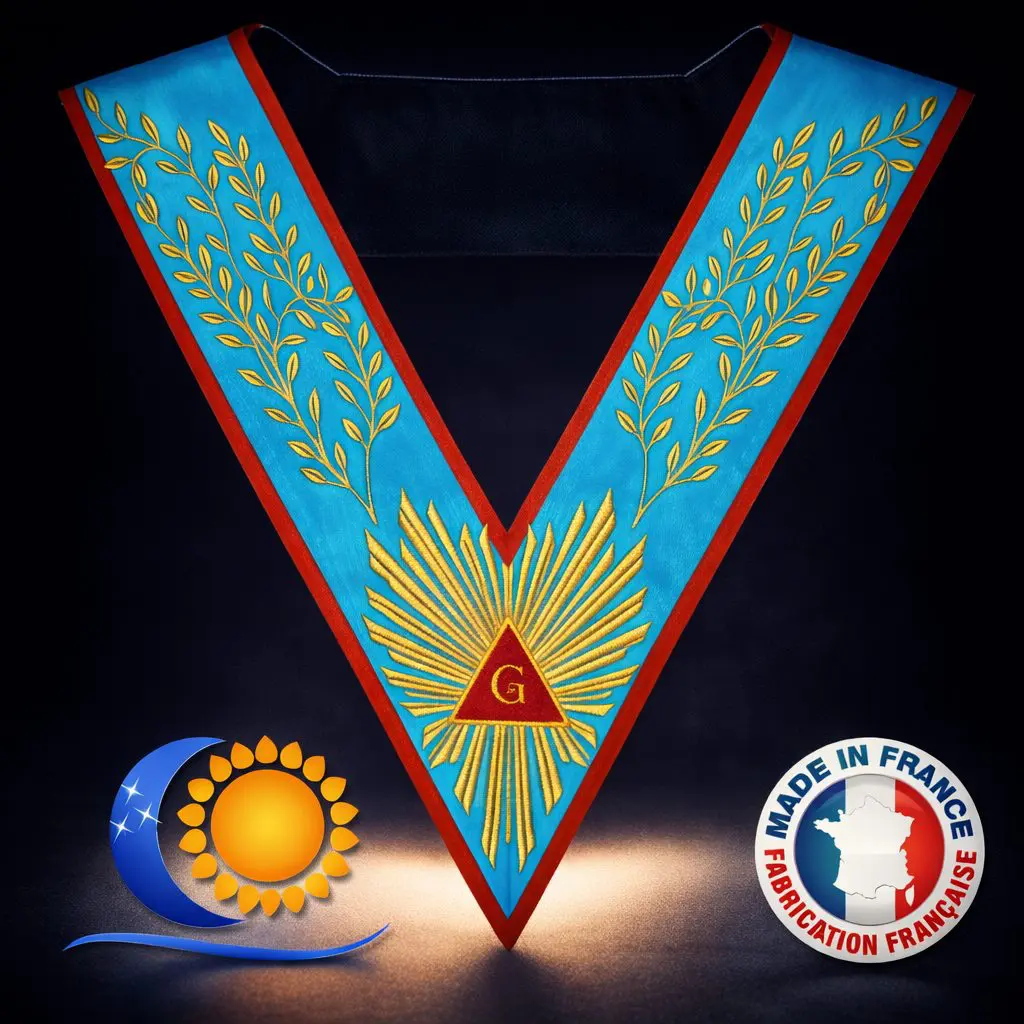 Sautoir de Vénérable Maître REAA Usage toutes obédiences ; GLNF, GL, GODF, DH, GLAMF.... Grande gloire, lettre G et grandes branches d'acacias remontantes. Ruban moiré 11 cm fabriqué en France, doublure tissus coton haute qualité noir avec symboles de deuil. Mousqueton à bijou et clip protège col à l'arrière. Fabrication traditionnelle dans nos ateliers à Montauban.